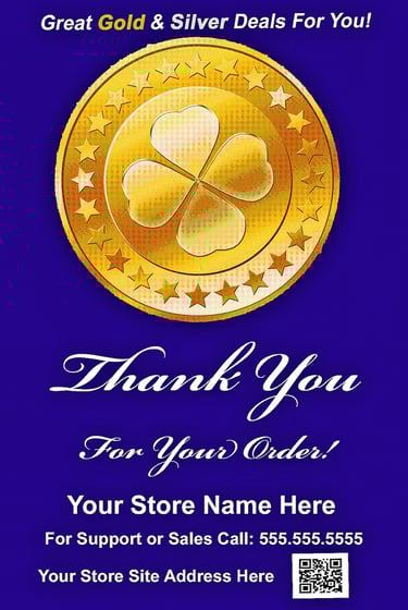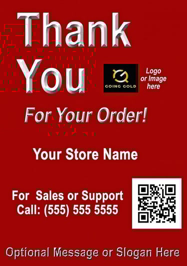 Personalize with your company name, phone number, logo, QR code, and an optional message of up to 25 characters. The minimum order is 100 pieces or more for the gold glossy thank-you labels.