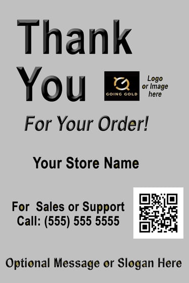 Personalize with your company name, phone number, logo, QR code, and an optional message of up to 25 characters. The minimum order is 100 pieces or more for the silver glossy thank-you labels.