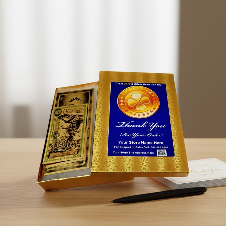 Customizable blue gold durable box designed with padding for the sale of silver or gold bullion. $2.39 each with a minimum order of 25, plus shipping.